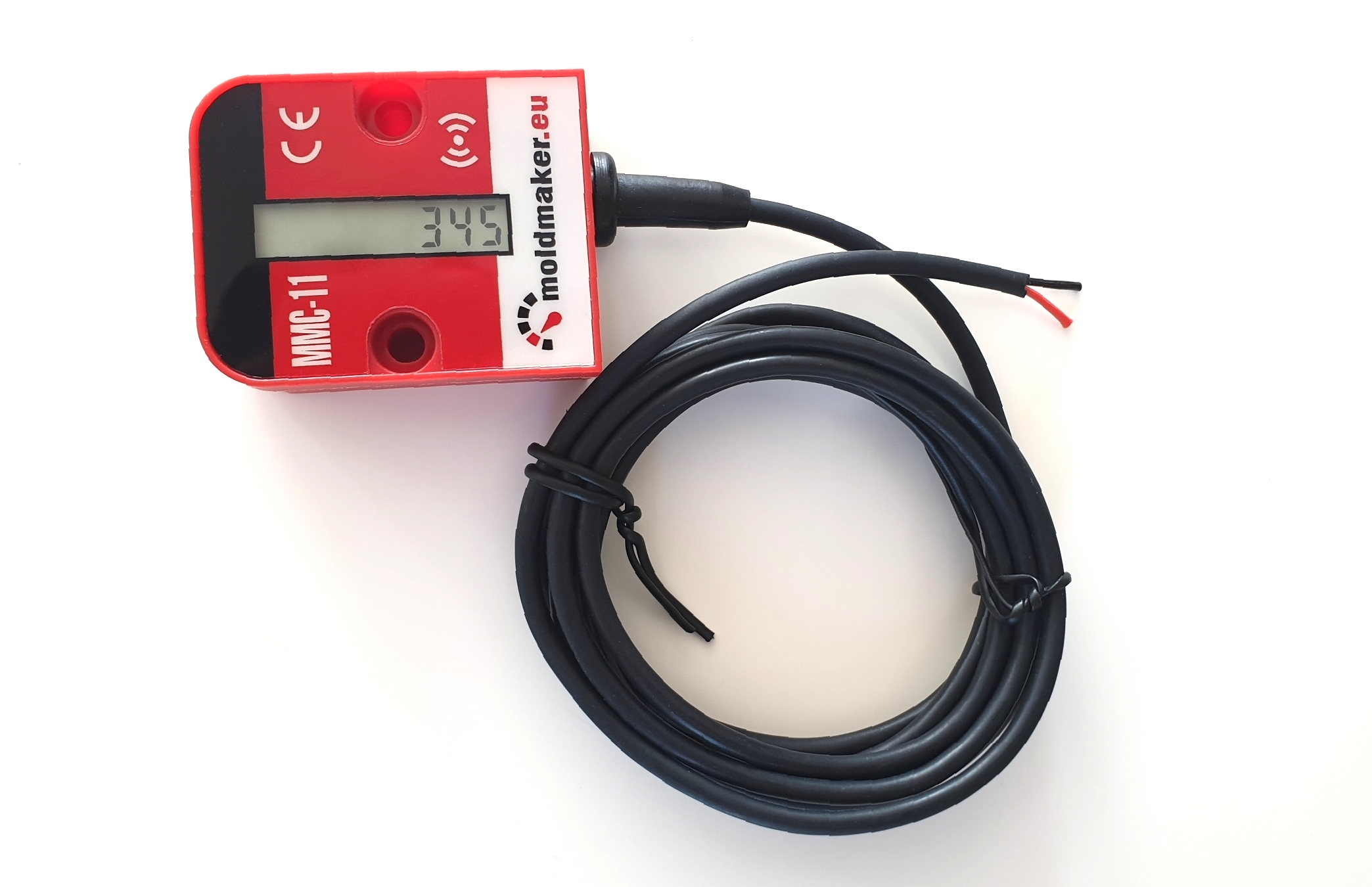A wireless device for registering machine cycle, e.g. a press or injection molding machine. Used in situations where it is required to count the cycles of the machine itself, or when there are other obstacles, e.g. mtool temperature exceeds 85 ° C. It’s then possible to count tool cycles on the basis of impulses from the machine controller. The MoldMaker system assigns pulses to the tool that is currently working on the machine.